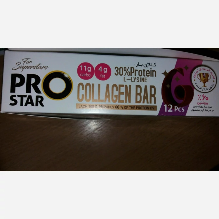 کلاژن بار محصولی دیگر از شرکت معروف پرو استار .هر بسته 40 گرمی دارای 30 درصد پروتئین و 12 درصد کلاژن و بدون شکر افزوده برای افرادی که به سلامتی خود اهمیت میدهند .سرشار از مواد مغذی و مغز های فشرده و روکش کاکائو